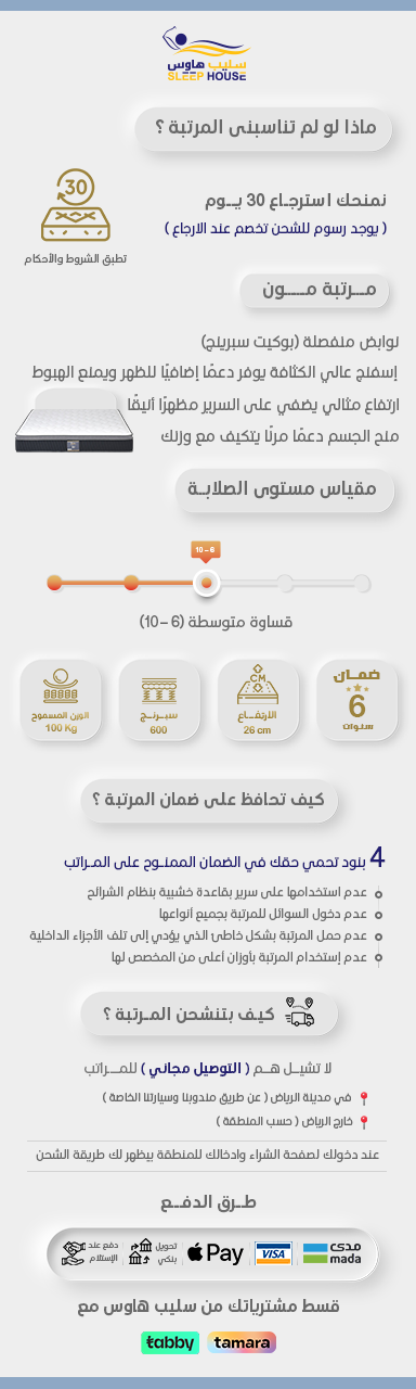 تقدم مرتبة مون MOON من سليب هاوس تجربة نوم متوازنة بفضل تصميمها متوسط القساوة واعتمادها على نظام النوابض المنفصلة. توفر المرتبة دعماً مرناً للجسم مع تقليل انتقال الحركة، مما يجعلها مناسبة للنوم المريح طوال الليل. ارتفاعها المناسب واحتواؤها على إسفنج عالي الكثافة يساهمان في توزيع الوزن بشكل صحي، بينما يمنحك ضمان 6 سنوات ثقة إضافية بجودة المنتج.