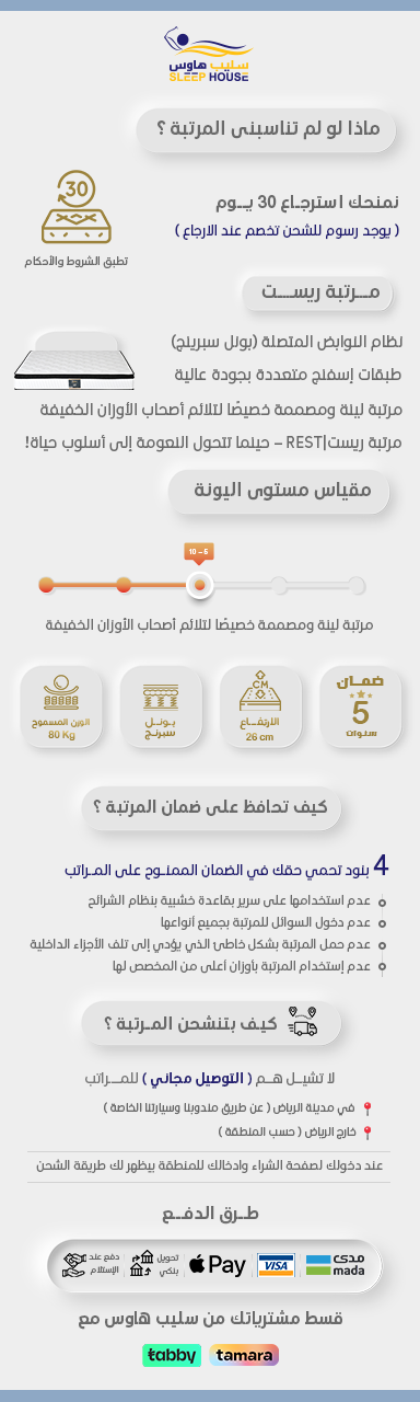 • الضمان لمدة 5 سنوات يضمن استمرار الجودة ويعكس ثقة سليب هاوس في صناعتها.